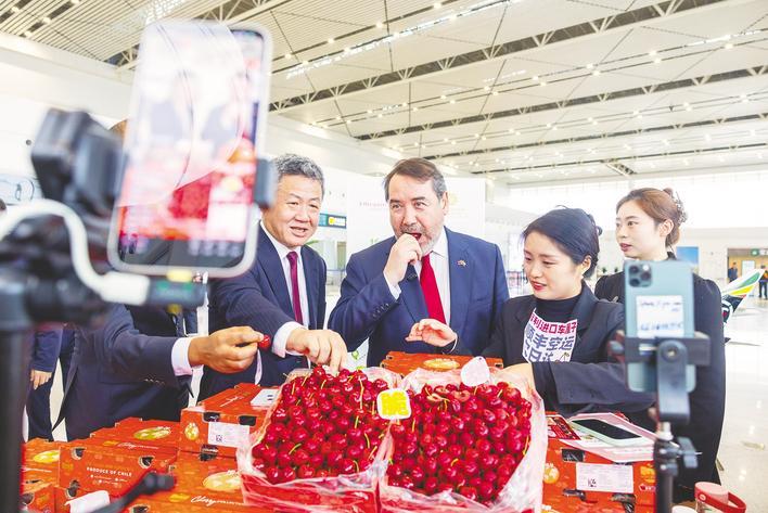 11月7日,智利驻华大使巴勃罗·阿里亚兰(右三)走进花湖国际机场樱桃直播间,向网友推介智利樱桃。 (湖北日报全媒体记者薛婷 通讯员刘小进 王兴宇 摄)