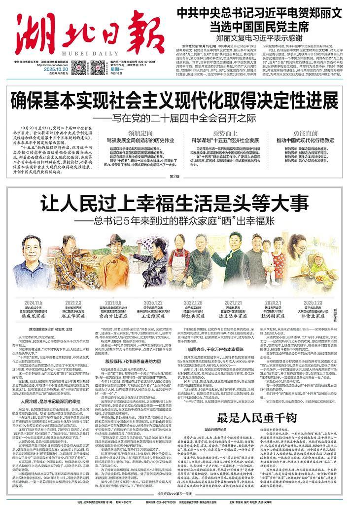 第1页,2025年10月20日 □ 湖北日报全媒体报道组 一本红边的书本,列出了五年来这个家庭令人满意的变化的条目;一张火辣的照片定格了一家人五年来幸福生活的剪影。 8个家庭、8个经济账户、幸福账户,反映了“十四五”期间亿万家庭的亿万个幸福账户。回顾“十四五”规划成就,规划“十五五”规划。湖北日报解放思想、转变形式。 10月20日,湖北日报重点推出《向总书记揭秘我家的幸福账》重磅报道,其中一页快讯与评论的重磅组合,4整版报道、新媒体图文混合产品、多形式微传播。它传达了习近平总书记五年来走访家庭的幸福账目,让“十四五”期间的进步和变化看得人、看得懂、信得住。全媒体系列报道是湖北日报在党的二十届四中全会召开之际推出的创新型主题报道。它用总书记的来访激励人们为“十四五”努力奋斗,生活得更加幸福,这是叙事逻辑。它用家庭账本上的小切口,读懂人心,体现“十四五”期间取得的伟大成就。通过特别的策划和特别的呈现,向我们伟大的母亲所经历的五年致敬。更广阔的全国视野,更窄的切口,更贴近群众,重点主题报道,创新策划。 “十四五”时期,中国现代化建设取得丰硕成果。如何才能清晰地体现人的存在感、幸福感、安全感?湖北日报编委会站在中间,放眼全国,提高地位,拓展视野,思考大局,跟随总书记五年视察,走访总书记走访的家庭,了解领导对人民的感情;通过家庭账本的一小片,记录了人们的成就感、幸福感、安全感,反映了“十四五”期间我国经济社会发展的开拓性进步、突破性变化和历史性成就。儿童教育、学生教育、工作收入、疾病医疗、养老、对弱势群体的住房和支持影响着数亿家庭。这是对民生的关心,也是总书记最深切的关怀。幸福账户的背后是党和政府的保障。人民的感受是“十四五”发展成就的最好检验。因此,对于“十四五”成就这一大主题,从家庭角度反映成就是一个小切口;对于家庭来说,账本只是一小部分。切片越小,对读者和网友来说越容易理解、更接地气。汉族、藏族、苗族、北方、中部、西部,农村、城市、山村……多民族、多地域、多路径,户口账本分布越广,主题就越广泛、具有代表性、普遍性,越接近微观,越能通过小切口体现大主题,参见宏。从湖北到各省区市,全媒体报道组精心挑选了近五年来秘书长走访过的8位家属代表。追随五年的炙热脚步,感受为民服务的热情践行“四力”跋涉,跨越辽阔的地形,从湖北江汉平原到贵州乌蒙山腹地;从青海的草山到辽宁的“天池”山;从山西太岳山腹地到西藏尼阳河畔;来自“天津一号京津”。这8户家庭分布在全国7个省、自治区、直辖市。总书记心中始终牵挂着人民,踏遍山水深入百姓家,其中不少位于农村、边远山区。八位记者跟随了这家人的脚步。e总书记来采访theanya,感觉很亲切;他们感受到了总书记对人民的情怀,那种感觉是温暖的。全媒体报道团队“四力行”,走遍祖国大江南北;通过深入调查研究,揭示“国家第一大人物”陷入“人民忧虑”。行前,记者们做了充分准备,收集了多份考察报告,掌握了8户家庭的基本情况,了解考察过程中的细节、场景、谈话等;他们研究了相关演讲精神,找到了采访切入点,制定了详细的采访大纲;他们带来了全媒体采访设备,一些记者在行李中装了运动相机。按照规划方案,记者重点探寻这8个家庭在“十四五”期间的变化,详细了解了全面了解家庭生活的各个方面,特别是家庭成员的工作、教育、住房、养老、医疗等情况,以及家庭所在社区、社区、乡村、城市等的相关情况。从个人到家庭到国家,从微观到中观到宏观,市场情况、省情、国情,这八个家庭是八个以小见大、真实体现“十四五”成就的活生生例子。在乡村振兴、产业升级、生态文明、文化建设、教育发展、人民经济保障、精神文明、社会治理等多个领域都有观察。雪光里清脆的书声,草山里鱼鸟天堂证书墙的梦想和路径。林芝区林芝镇嘎拉村达瓦建森一家西藏自治区林芝市、青海省海北藏族自治州刚察县果洛藏工玛村藏族牧民索南才让,是总书记的藏族家属,2021年赴西藏、青海克服高原反应、天气寒冷等困难进行采访。记者杨洪斌9月30日早上6点从武汉出发,只身前往西藏,行程2800多公里,于10月2日抵达达瓦坚参家。听着达瓦坚赞讲述自己家的情况,记者深受感动。客厅墙上的24张奖状上写满了达娃江深对总书记“一定要教育好后代”的承诺。记者抓拍到达瓦坚申出示两个孩子的证件。藏族男子的脸上写满了自豪和憧憬;金证书耕耘梦想赛道(10月20日第五版《童心》)周三,记者乘坐飞机转乘班车,花了一整天的时间抵达青海省刚察县。第二天一早,记者来到索南进行采访,还采访了村史馆和村镇干部,看看村里的变化。下午,索南骑着摩托车接过记者一起去牧场,了解生态建设情况。村里49名生态管理者中,索南牢记着总书记的嘱托,记者们用笔做笔记,用手机录音、录像,用运动相机记录下整个采访过程,拍摄了40多GB的照片和视频资料(10月20日第4版《看了《鱼鸟乐园》,也有了幸福的家》)。起身展翅,“天池”山峰闪烁。 28个弯的耐心和感恩。贵州省黔西市新仁苗乡花屋村赵玉学一家、辽宁省葫芦岛市绥中县明水满族乡朱家沟村王保伟一家等少数民族家庭分别于2021年和2025年拜访总书记。黔黔高速公路,记者王小五
